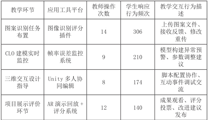 图案识别与 CLO 建模两个环节的交互频率最高,说明学生在基础建模与图形处理阶段的参与度较高,教师也投入较多实时干预行为。Unity 交互设计与项目演示环节交互频次略低,反馈显示部分学生在脚本逻辑构建与互动参数设定中仍存在技术瓶颈。教师后续教学中增加针对交互逻辑构建的训练频次,并在实验室开放时间增加一对一技术指导比例,以平衡各模块的掌握深度。
