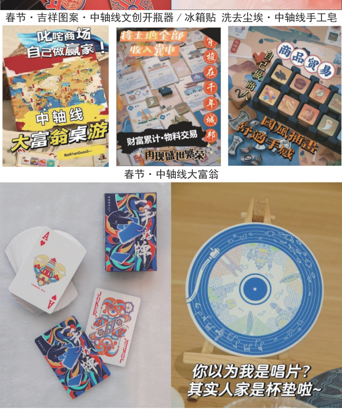 ② 在每个北京中轴线 - 春节文创打卡点内,都有各式各样的春节元素 x 中轴线文创产品:如春节·吉祥图案·中轴线文创开瓶器 / 冰箱贴、春节·中轴线大富翁、一手好牌·中轴线春节扑克牌、过年也喝茶·中轴线茶杯垫、洗去尘埃·中轴线手工皂、中轴线·灯笼等一系列创新文创产品。通过购买文创产品可以了解春节以及中轴线文化,而且文创消费还可以参与中轴线手册签到打卡盖章。