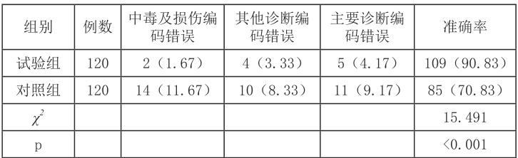 病案室为医院中重要的组成部分,其工作内容为负责患者病历资料(检查结果、手术记录、医嘱、诊断报告、入院记录等)的保存和管理[1]。在医学研究、患者治疗、日常运营中病历资料均发挥重要作用[2]。病案室管理中病历资料需保证机密性、准确性和完整性,在医院研究和医疗质量评估中病历资料也发挥着重要作用 [3]。因此,需做好病案室管理工作。伴随近些年来信息技术的不断发展和进步,病案管理也向现代化、智能化、电子化发展,在病案室管理中应用病案信息技术具有较好的可行性和应用前景,可提升病案质量,可提升编码准确率 [4]。本文选择两个时段的病案各 120 份,进一步明确病案信息技术的应用价值,结果如下。