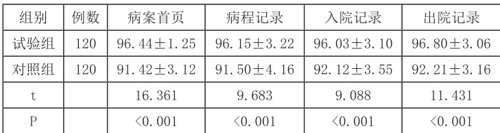 对比病案管理质量,试验组评分均较高 (P⟨0.05) ),见表1。