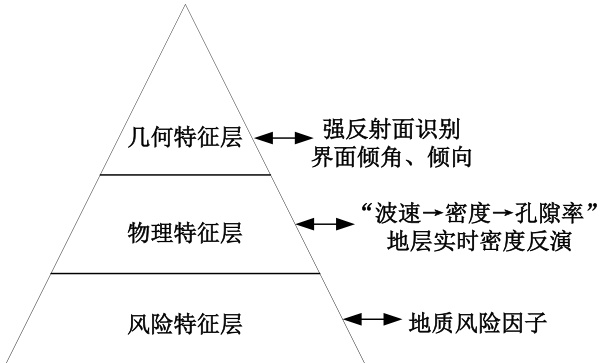 如图1,第一层为几何特征层,利用Canny 边缘检测法,对雷达图像内 >0.2 反射系数的强反射面进行识别,随后使用 Hough 变换提取地震波相同轴延展趋势,对界面倾角、倾向等参数进行量化,保证误差 ⩽3 °。第二层为物理特征层,需要建立波速→密度→孔隙率转换模型,结合钻孔取芯的数据对地层实时密度进行反演,孔隙率误差需保证在 ±2% ,地层实时密度精度应保证 ±50kg/ m³。第三层为风险特征层,利用