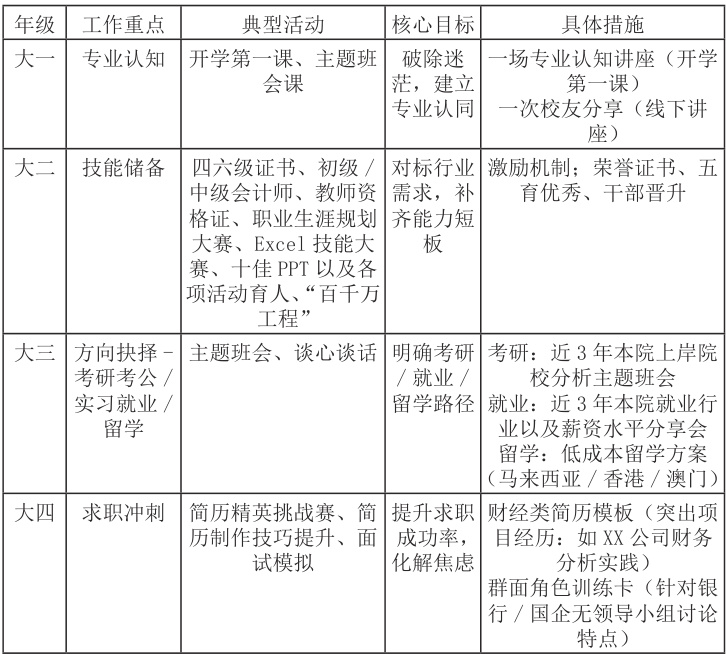 财经学院围绕学生主体构建 4 阶段(大一至大四)职业发展体系,主要通过以下三个方面搭建递进式赛事平台,充分发挥学生的就业内驱力,化被动催促为主动尝试。首先,把握课程育人导向。辅导员与就业、创业课老师积极沟通,从学生的需求入手开展教学,帮助学生树立正确就业观。其次,打造活动育人平台。广泛开展职业规划大赛、简历精英挑战赛、财会专业Excel 技能大赛、十佳 PPT 等,以赛促进。三是抓住实践育人契机。积极推动“百千万工程”社会实践活动,组织到企业参观学习,鼓励学生报名参加“人职匹配”实践育人,进一步提升学生就业竞争力。