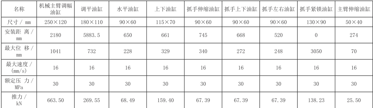 作为台车核心作业机构,工作机构主要包含两级伸缩主臂、调整臂、抓手调整臂、抓手体等结构件及液压、控制系统构成。拱架举升与姿态调整需多工作臂联动,自由度越多控制越精准。在工作机构设计过程中要确保伸缩主臂自由伸缩、连接左臂实现俯仰调平、连接右臂实现水平方向摆动、抓手下臂俯仰、抓手上臂伸缩、抓手调整臂俯仰调节、抓手体侧摆调节及夹紧等动作。抓手体左右摆动通过抓手侧摆油缸,抓手夹紧由夹紧油缸完成。各个主动油缸的设计驱动参数如表1 所示。