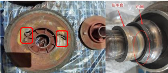 拆检发现:轴承系统损伤集中于非驱动端——7313BECBJ 角接触轴承内圈塑性变形、保持架断裂;轴承套严重变形鼓包,与轴径抱死,配合处轴径磨损深度达 5mm。隔板组件呈现区域性失效:第 1~4 级及第 7 级隔板因流体冲刷大面积穿孔,穿孔边缘呈蜂窝状蚀坑;第 5~6 级隔板结构完整无异常;平衡鼓表面仅存在轻微磨损。辅助部件中,非驱动端冷却风扇内孔磨损明显,而驱动端与非驱动端机械密封外观检查均未发现破损或泄漏痕迹。