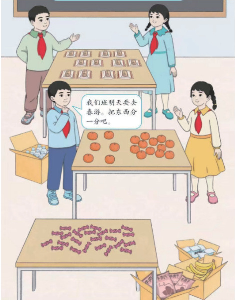 教师利用教材中“班级春游分东西”的情境(如图1),引导学生观察:“同学们要去春游,需要把这些食物分一分,怎样分才公平呢?”学生结合生活经验,很快说出“平均分”,教师顺势复习平均分的概念:“每份分得同样多,叫做平均分。”