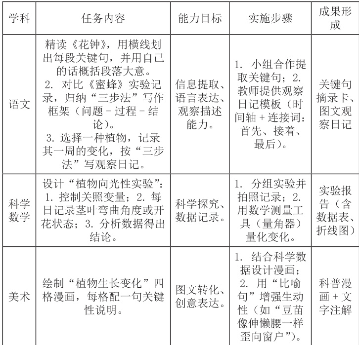 核心素养导向的小学语文跨学科教学,要精心设计驱动性情境任务单。以三年级下册“大自然的奥秘”单元来讲,教师结合本单元目标,创设出真实情境,设计跨学科主题学习单(见表1)。学习单以语文能力为核心锚点,通过“问题链”驱动科学探究与艺术表达,实现学科融合。