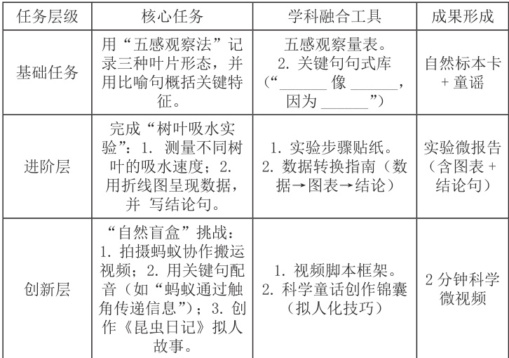 研学旅行是连接课堂与自然的桥梁。在“大自然的奥秘”单元教学的一个周末,教师设计了“生态观察家”主题研学任务,开展了郫都区清水河公园“自然侦探营”研学活动。研学任务采用三级进阶式学习单(见表 2),每级任务均包含“观察- 记录- 表达”的语文实践闭环,并嵌入跨学科工具包。