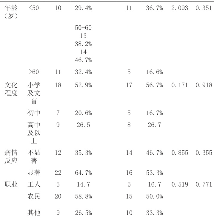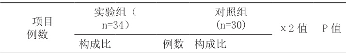 随机选 2023 年 1 月至 2024 年 1 月入选的 40 例患者为对照组,2024 年 1月至 2025 年 1 月入组的 40 例患者为实验组。失访 16 例,最终 64 例患者完成研究,其中实验组34 例, 对照组30 例。病例流失的原因为:并发其他疾病3 例,中途退出 4 例(实验组),死亡 2 例,搬迁不详且电话不通 5 例,终止放疗改为吃中药2 例。