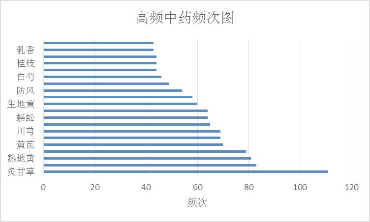对张炳厚教授应用三两三治疗痛症的中药处方进行频次统计,结果显示,本研究所纳入的中药处方中,共涉及中药281味,中药应用总频次为3138次。其中,使用频次排在前10位的中药依次是:炙甘草(111)、当归(83)、熟地黄(81)、三七(79)、黄芪(70)、没药(69)、川芎(69)、全蝎(65)、蜈蚣(64)、五灵脂(64),表明这些中药为张教授应用疼痛三两三治痛证最常用的药物,如图4。