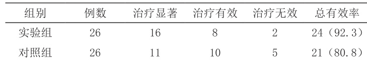 通过对比实验组与对照组间的治疗总有效率,实验组治疗显著 16 例、治疗有效8 名、治疗无效2 例,治疗有效率为 92.3% ;对照组治疗显著11 例、治疗有效 10 名、治疗无效 5 例,治疗有效率仅为 80.8% ,实验组的患者具有明显优势,差异结果显著 (P⟨0.05) ),具有统计学意义。见表1。