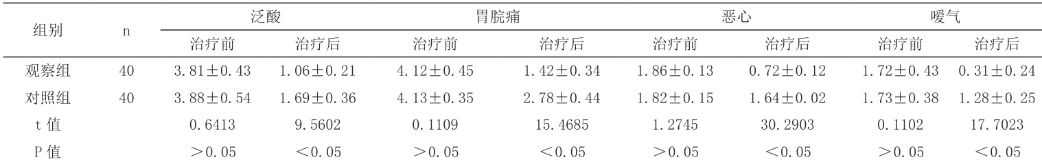 表2 对比患者泛酸、胃脘痛、恶心、嗳气症候积分(
