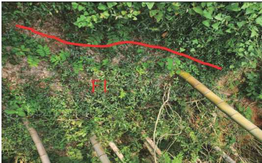 据现场调查,滑坡位于益阳市赫山区衡龙桥镇樟树咀村铁铺组,共有一个滑坡体,其平面均为不规则的“圆弧”状形态,坡向约为 179º,坡度为 35∘~55∘ ,坡脚岩层产状为 240~250∘ ° ∠10-11∘ ,与滑体呈斜交坡。该滑坡体北部为滑坡体后缘,以相对平缓区为界,东端以一自然山脊为界,西面以一自然山脊为界,南部为滑坡体前缘(剪出口),以斜坡陡坡段与缓坡交界为边界;滑坡纵向长约25m,横向宽约110m,滑坡体厚 2~3m ,主滑方向约179° ;滑坡体组成物质为第四系冲积成因的黏土与砂卵石互层,可见厚度约 2~5m. 。