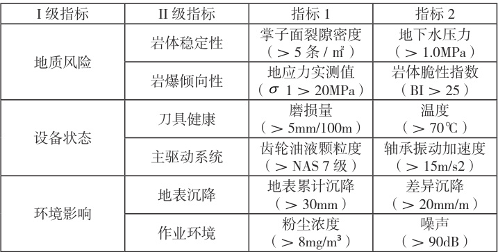 如表 2,岩体稳定性指标体系下的指标参数主要作为风险预警指标,岩爆倾向性指标用于建立岩爆风险等级模型(I~V 级别)。刀具健康指标用和换刀阈值进行实时对比,主驱动系统指标用于预测机械故障的概率。作业环境下的指标用于联动通风系统进行风量自动调节。在此基础上,建立单指标预警 + 多指标耦合评估机制、例如,在地表沉降超出阈值,同时刀具磨损速率异常期间,系统自动判定为 II 级风险,随后触发地质复核 + 参数调整 + 通知人员撤离的组合措施。
