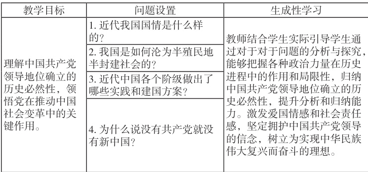 例如在高中政治必修三《历史和人民的选择》一课的学习中就可以积极引导学生参与知识建构。高一学生对于中国共产党的诞生背景具有一定的了解,但由于学生的知识来源比较单一碎片化,缺乏对于中国共产党执政是历史和人民的选择缺少系统化的认识,所以有必要引导学生参与知识的建构。可让学生课前自主学习设计调查问卷以及现场由小记者学生对于其他学生进行采访的形式开展。