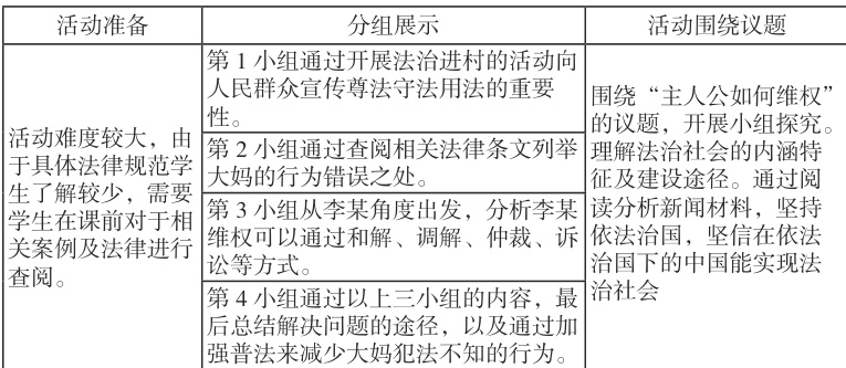 例如必修三第八课《法治社会》的学习时就可以采用议题“主人公应该如何维权”。主人公李某车辆正常停放因影响大妈跳广场舞,大妈王某故意划伤车辆,称想让车主知难而退。李某应当如何维权?对于此类事件应该如何防范?为此,学生们经过自主学习后分为四小组分别从信法、守法、用法及总结这四方面为李某维权以及减少此类现象进行分析。