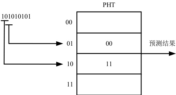 每当执行一次分支指令后将跳转结果写入 BHR 的低位,舍弃掉高位,则BHR 会交替出现01 和10 两种状态。当出现01 状态时,指向PHT 中第二个表项,由于 01 的下一次跳转情况为 0,也就是下一次该分支指令一定不跳转,因此指向 01 表项的饱和计数器会达到强不跳 00 的饱和状态,即预测该分支指令不跳转。而 10 状态的下一次分支一定跳转,于是指向 10 的表项也会被训练成强跳11 的饱和状态预测该分支指令跳转。
