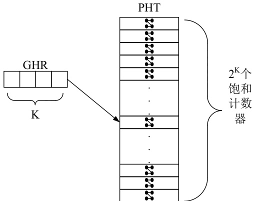 该方法利用 GHR 对 PHT 进行索引,位宽为 k 的 GHR 对应的 PHT 中饱和计数器的个数为 2k 。面对上述例子,当对分支指令 b3 进行预测时,GHR 中低两位的结果可能时 00、01、10、11 中其中的任何一种,若 GHR 中最低两位记录的值为 11,即 b1 以及 b2 两条分支指令均发生跳转,则会预测 b3 同样发生跳转。但若是其它三种情况则 b3 可能跳转也可能不发生跳转,此时的预测准确度就无法保证。最理想的情况是根据 PC 地址的不同为每条分支指令分配一个 PHT,这样每条分支指令在预测时均采用 GHR 对当前指令对应的 PHT 进行寻址,由于每条指令有着不同的 PHT,所以即使相同的 GHR 也不会寻址到同一个饱和计数器造成冲突。但如此会占用大量的存储空间,可以通过对 PC 地址进行 hash 处理,使其利用更少的位宽以区分不同的分支指令,就能使用更少的 PHT0 。最简单的方法就是只使用一个 PHT,缺点是会发生 GHR 相同的不同分支指令共同访问同一个饱和计数器的情况。当这两条分支指令跳转方向相同时,彼此之间就不会造成负面影响,甚至能使饱和计数器更快速的被训练至饱和状态。但是若两条分支指令跳转方向不同,则会不断的更改饱和计数器的值,使其无法到达饱和状态。