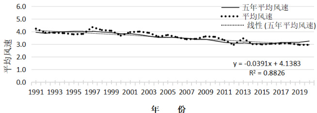 5 年滑动曲线显示,彰武县平均风速为波动性变化,整体呈“上升- 下降”2个阶段。1991— 2003 年平均风速为 4.0m/s ,高于多年平均值,为风速较大阶段;2004—2020 年平均风速为 3.3m/s ,低于多年平均值,为风速较小阶段。