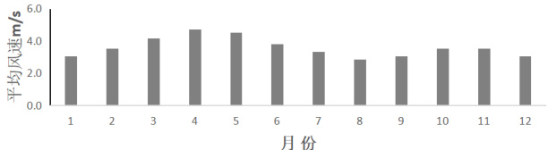 。7~9 月是风速偏小的月份,为风速低谷期,平均风速为 3.1m/s ,其中 8 月为全年最低谷,平均风速为 2.9m/s 。10~11 月风速逐渐增大,平均风速为 3.5m/s⨀ 。12 月至次年1 月风速逐渐减小,平均风速为 3.0m/s⨀ 。