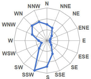 彰武县风向玫瑰图(图 3)分析表明,彰武县年风向的发生频率差异显著,静风发生频率为 5.1% ,主导风向为南西南风(SSW)、南风(S),2 个主导风向频率均大于 10% ,其中 SSW 风向频率最高,为 14.8% ,最少风向为 ESE,频率仅为 1.6% ,次少风向为 E,频率为 1.3% 。