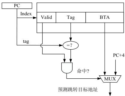 BTB 本质上是一个 Cache,使用 PC 地址作为索引地址 Index。由于 BTB容量有限,只能使用 PC 地址部分位作为索引,因此 BTB 存在索引地址相同但是 PC 地址不同的指令索引到同一个表项的情况,影响 BTB 的预测准确率。故 BTB 中除了记录分支目标地址(Branch Target Address,BTA)外,还存放着 PC 地址的部分位作为标签 Tag,用于区分不同的指令,并且 BTB中还有一个表示该表项是否有用的Valid 位。在预测时,利用PC 索引BTB,读出表项中预测结果,之后将表项中的 Tag 位与 PC 地址部分位进行比较,若两者相匹配且该表项 Valid 部分为 1 则表示命中,即当前预测目标跳转地址有效。未命中则预测跳转目标地址为 PC+4 ,即顺序取指的下一条指令地址。
