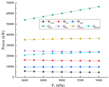由图 2 可知 , 随着压缩机入口压力 P1 的增大,压缩机功率 WCOM 和膨胀机输出功率 Wtur 均减小,净发电量均呈现先增大再减小。系统在压缩机进口压力为 9.2mPa 时达到净发电量最大值为 9.79MW。随着 P1 的增大,加热器换热量 Q 均减小。这是因为随着 P1 的增大,加热器热侧入口温度 T7 保持不变,加热器热侧出口温度T8 增大,加热器热侧的焓差减小,烟气的质量流量保持不变,所以加热器换热量减小。