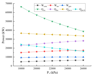 已知压缩机的进口压力和压缩机的出口压力时,可以通过固定 T1、T4 和T7 值来计算剩下点的温度。其中,点 2 可通过压缩机的性能曲线得知;点5 由膨胀机的性能决定。所有物质的物性参数均来自 NISTREFPROP。此外,传热温差为 10K、进入加热器的 CO2 质量分流比为 0.7372、压缩机等熵效率为 0.8和膨胀机等熵效率分为 0.83