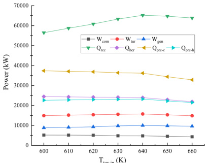 如图 4 所示,膨胀机进口温度 Ttur-in 变化范围为 760~590K, 变化间隔为 10K 。为方便观察仅展示变化范围 600~660K 的数据,随着膨胀机进口温度Ttur-in 的增大,系统的膨胀机输出功率 Wtur 先增大后减小,系统净发电量均呈现先增大再减小,在Ttur-in 为640K 时达到净发电量最大值为10.01MW。