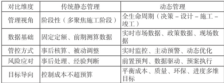 工程造价动态管理是以项目全生命周期为时间维度,以实时数据为决策依据,以动态调整为核心手段,实现造价“事前预测、事中监控、事后复盘”的全流程管控模式。其核心特征区别于传统静态管理,具体对比如下: