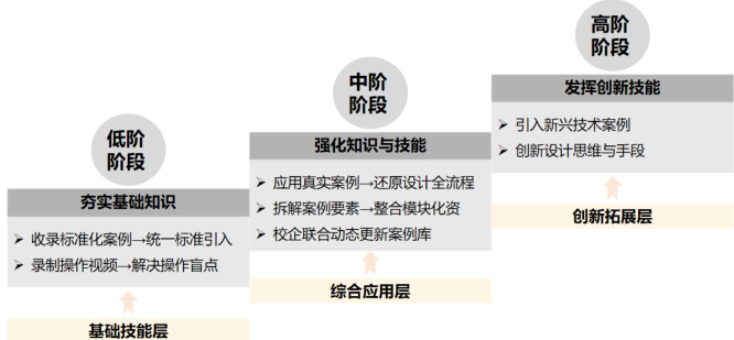 教师按照学生认知及技能发展规律,以效果图制作岗位需求为导向,构建“低阶基础→中阶综合→高阶创新”的三梯度进阶式实践教学资源库: