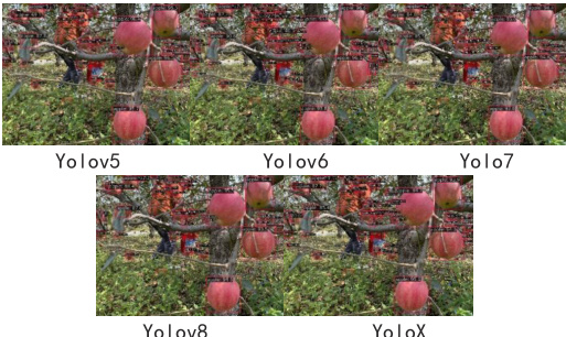 从上表 1 苹果检测的可视化表结果可见,各 YOLO 系列模型在自然场景下的检测表现存在显著异质性。 YOLOv5 的检测存在较严重的漏检问题,大量苹果目标未被检测框覆盖,反映出其对复杂果园场景中苹果目标的召回能力不足;YOLOv6 虽能识别部分苹果,但存在大量重复标注的检测框,且对小尺寸、密集分布的苹果目标的特征区分能力较弱,导致检测结果的冗余性与模糊性较高;YOLOv7 的检测边界框与苹果真实轮廓的拟合程度欠佳,部分框选区域存在明显偏移,同时仍有部分苹果未被有效检测,说明模型在目标定位精度与召回率的协同优化上仍有改进空间;YOLOv8 的检测结果中,苹果目标的检测框数量与实际目标数量匹配度较高,边界框对苹果轮廓的包裹性更强,漏检现象显著减少,体现出其在多尺度特征提取与检测框精准回归方面的优势;YOLOX 虽能识别大部分苹果,但相较于 YOLOv8,其检测框在部分苹果目标上的定位精度稍低,且在苹果密集区域的检测框重叠干扰问题更为突出,对密集目标的细粒度区分能力仍需强化。