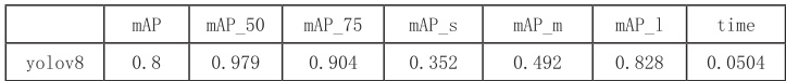3. 大尺寸苹果(bbox_mAP_l):YOLOv8 的数值为 0.828,在各模型中处于领先地位,验证了其对不同尺寸苹果目标检测的稳定性和鲁棒性。