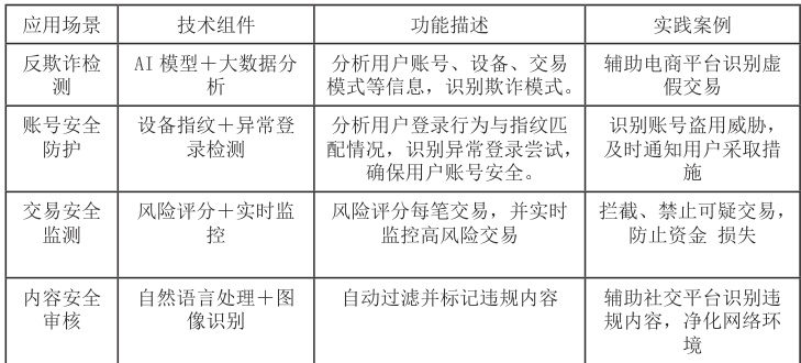如表 1 所示,腾讯天御风控平台可被用于反欺诈检测、账号安全防护、交易安全监测以及内容安全审核等多场景中[1]。