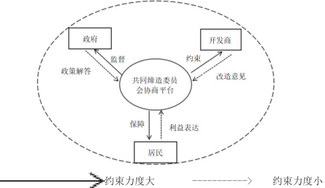 为了促进城市更新中各主体达成共识,2018 年成立了共同缔造委员会,采用“政府主导,企业承办,居民参与 ”的更新改造模式(见图 3),共同缔造委员会共有25 位委员,名单由各方推荐及选举。其中12 名为居民代表,其余为专家顾问、媒体代表、商户代表等,委员会的定位是政府领导下的议事平台,协商平台的搭建充分调动了各方参与的积极性,保障了各方主体的利益。