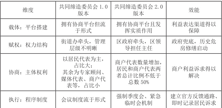由于缺乏监管,共同缔造委员会 1.0 版本早期运营中出现问题,成为了形式化的存在,2019 年以来委员会实质上陷于瘫痪,“居民微信群投诉无响应”“年均 1 次会议沦为汇报会”,至 2024 年换届前参会者仅存 4 人。改造后的共同缔造委员会2.0 版本对上述结构性缺陷,做了以下修改:一是行政权力结构升级。2024 年共同缔造委员会2.0版本与以往最大的不同就在于第一次有区领导参与委员会并担任主任,根据媒体报道:“以往危房搁置问题最终由区委垫资修缮解决”,这也说明了当行政权力直接介入时,历史遗留问题才能被推动解决,一定程度上解决了市场失灵的问题;二是主体结构调整。在原有代表的基础上增加商户代表,居民和商户代表比例不低于总数 50%,大大提高了居民和商户代表数量,这一重构回应了改造过程中商户诉求长期被压制的问题;三是在规章制度上,由原来的无固定开会变为了每季度召开一次会议并形成会议纪要,从根本上规避了共同缔造委员会 1.0 版本的“年议一次”“微信群投诉石沉大海”的程序失效。(见表 1)