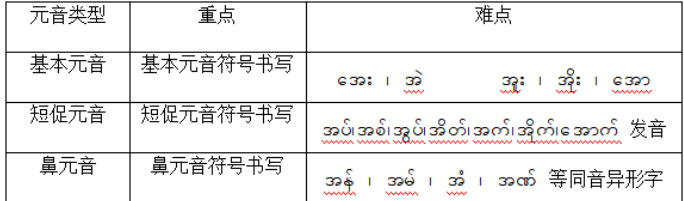 缅甸语的元音系统主要包括以下三类:基本元音(也称单元音)7 个、短促元音 8 个、鼻元音(也称鼻化元音)7 个,三类元音合计 22 个元音。如果把声调变化包含在内,则可以形成发音和文字符号相对应的 22 组元音。在本章节的学习过程中,易混淆基本元音、短促元音的发音方法、鼻元音的文字符号变化既是教学重点又是教学难点。