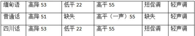 缅甸语的声调分为高降、低平、高平、轻声调四类。其中高降、高平、轻声调在普通话母语中有近似声调,学生可以借助母语声调基础,学起来相对容易。具体对应如下:高降调对应普通话四声声调,高平调对应普通话一声声调,轻声调对应普通话轻声声调。低平调在普通话中虽不存在,但可以借助地方方言相似声调辅助学习。低平调在四川方言中大量存在,是四川话中的主要声调之一。缅甸语的声调与普通话的声调有着较高的相似度,而与四川方言的声调相似度更高,仅在短促调方面存在一些差异。缅甸语中短促调大量存在且短促感明显,四川方言中短促调少量存在且短促感减弱。因缅甸语与汉语同属于汉藏语系语言,借助两者之间的声调亲缘关系,学习中既通俗易懂,又能激发学生学习兴趣。按照五度标调法(1最低,5 最高),缅甸语、普通话、四川方言声调对比如下:
