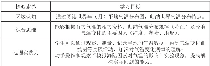 根据《义务教育地理课程标准》(2022 年版),课标对《气温的变化与分布》的内容要求:“阅读世界年平均气温和 1 月、7 月平均气温分布图,描述和简要归纳世界气温分布特点;阅读某地区气温数据资料,绘制气温曲线图,说出气温随时间变化的特点;结合实例说明纬度位置、海陆分布、地形等对气候的影响”根据以上标准,结合学情可以将学习目标细化,见表1