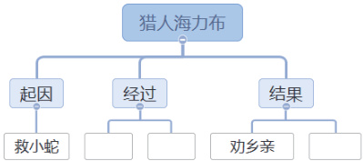 文章大致内容的概括,向来是语文教学的难点,“说说课文写了一件什么事”因为太笼统缺乏操作性而让学生不知所措。思维导图清晰的条理性,能直观显现文章各部分内容,从而帮助学生对起因、经过、结果各部分的构件进行分析、判断、整合,从而“规整”为对整篇文章大意的把握。因此,教师可以在预学单中,设计思维导图来帮助学生概述文章。以《猎人海力布》为例,通过绘制思维导图,学生能够按照事情发展的先后顺序,理清文章脉络,有效地提高预习效果。