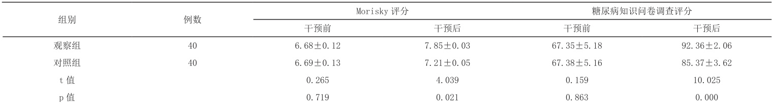 干预前两组 Morisky 评分、糖尿病知识问卷调查评分差异小 (P>0. 05),干预后观察组 Morisky 评分、糖尿病知识问卷调查评分均高于对照组 (P<0.05)