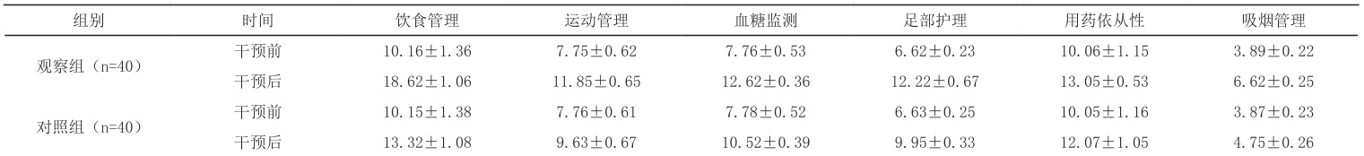 干预前两组下述维度得分差异小,①饮食管理、②运动管理、③血糖监测、④足部护理、⑤用药依从性、⑥吸烟管理 (P>0.05) ),干预后观察组下述维度得分均高于对照组,①饮食管理、②运动管理、③血糖监测、④足部护理、⑤用药依从性、⑥吸烟管理 (P<0.05)