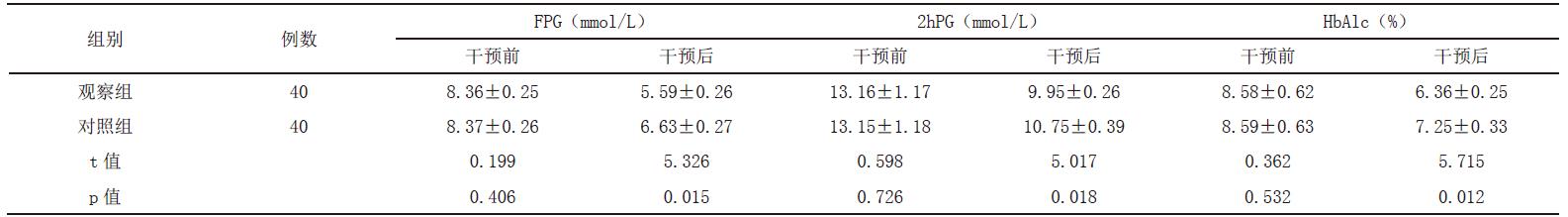 干预前两组下述指标差异小,① FPG、② 2hPG、③ HbAlc(P > 0.05),干预后观察组下述指标均低于对照组,① FPG、② 2hPG、③ HbAlc(P< 0.05)。