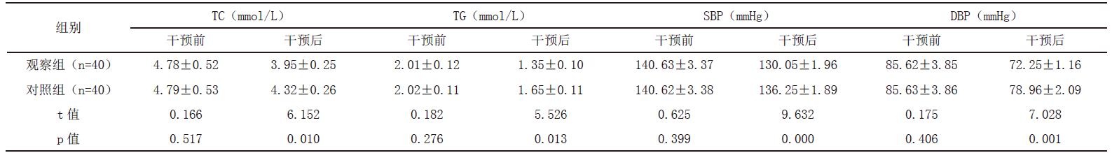 干预前两组下述指标差异小,① TC、② TG、③ SBP、④ DBP(P > 0.05),干预后观察组下述指标均低于对照组,① TC、② TG、③ SBP、④ DBP(P < 0.05)。