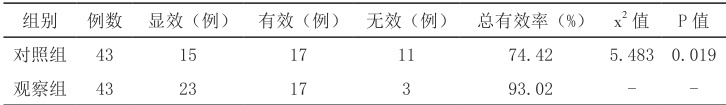 观察组治疗总有效率为 93.02% ,显著高于对照组的 74.42% ,差异具有统计学意义 (P⟨0.05) ),具体数据见表1。