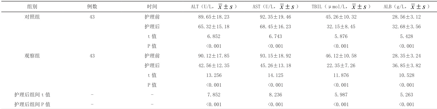 护理前,两组患者 ALT、AST、TBIL、ALB 水平比较,差异无统计学意义( (P)0.05) );护理4 周后,两组患者ALT、AST、TBIL 水平均较护理前降低,ALB水平较护理前升高,且观察组上述指标改善程度优于对照组,差异具有统计学意义 (P⟨0.05) ),具体数据见表2。