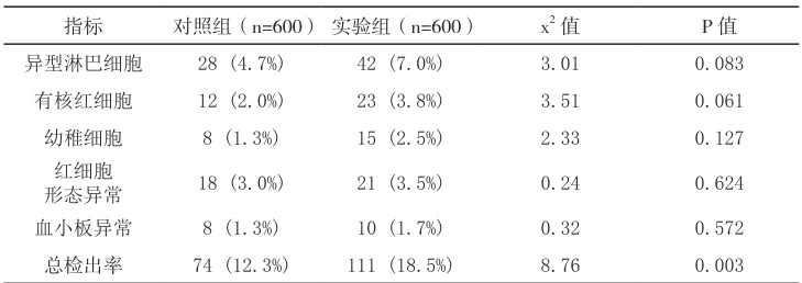 实验组异常血细胞总检出率显著高于对照组( :P⟨0.05: ),详见表1。