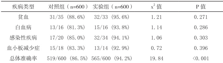 实验组血液疾病总体诊断准确率明显高于对照组(详见表2。