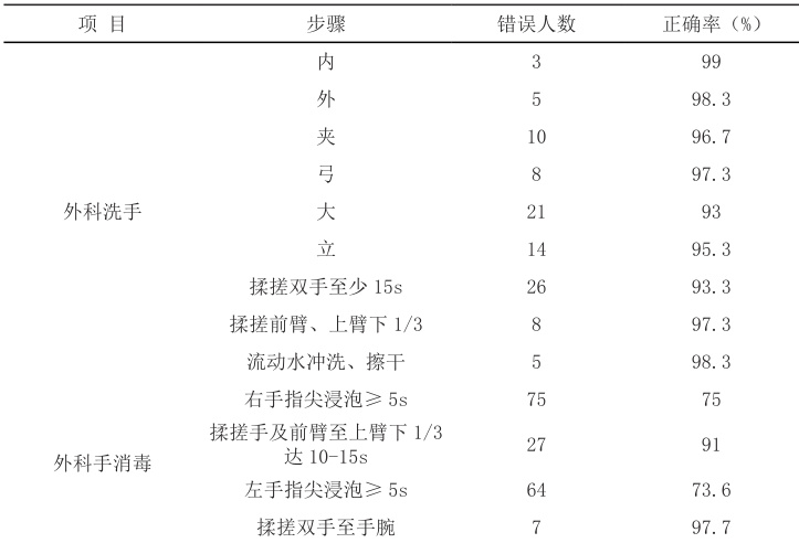 表1 300 名参加手术人员外科洗手及手消毒步骤调查情况 1% )