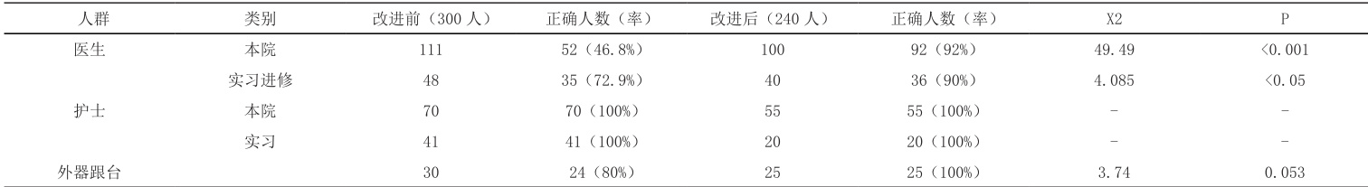 2.2 问题步骤“左右手指尖浸泡≥ 5s”不足的人群正确率对比 针对主要问题步骤改进前 300 人手术人员中,其本院医生、实习进修医生、外器跟台人员操作正确率分别 46.8%、72.9%、80% ;改进后 240 人手术人员中,本院医生、实习进修医生正确率分别提升至 92%、90%(P<O.05),差异具有统计学意义、外器跟台人员正确率提升至 100%(P=0.053),符合医院制定目标值、两组护士包括本院与实习护士均达标,与手术室护理人员日常扎实感控培训与带教密不可分。见表 2。
