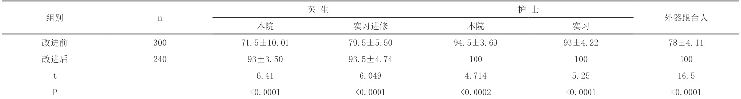 多元化的培训与考核。罗逸等研究 [8] 视频播放与情景模拟在手术室院感知识培训中具有提升医护人员的院感知识认知度与操作实践作用。手术室制作外科手消毒教学视频于手术室更衣室循环播放,供大家学习;感管处将《医务人员手卫生规范》重点关键点纳入应知应会内容,制定培训考核计划,发布 OA 系统推送各科室,由感控医生 / 护士进行科内相关感控培训,考核成绩报送感管处;感管专职人员对问题多的科室开展进科室感控培训,并现场考核;跟踪评价科室对实习、进修人员外科手消毒、无菌技术等感控的培训与考核落实效果。改进后本院医生、实习进修医生外科手消毒步骤正确率均提升(P<0.05),实习进修医生组正确率 90%,临界医院制定的目标值,考虑存在人员更换批次不同步,归属感不强,科室培训与评价工作有待进一步改进提高。外器跟台人员正确率提升至 100%,P=0.053 虽没有统计学意义,已达到医院的目标值,故改进措施有效。外科手消毒理论知晓率本院医生、实习进修医生、本院护士、实习护士均提升,有显著差异(P<0.05)。
